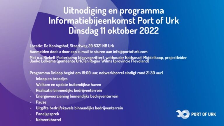We praten u graag bij over de laatste ontwikkelingen binnen Port of Urk. Riekelt Pasterkamp (dagvoorzitter), wethouder Nathanaël Middelkoop, projectleider Janko Lolkema (gemeente Urk), Rogier Wilms (provincie Flevoland) en anderen verzorgen het programma. Broodjes en drankjes staan klaar vanaf zes…