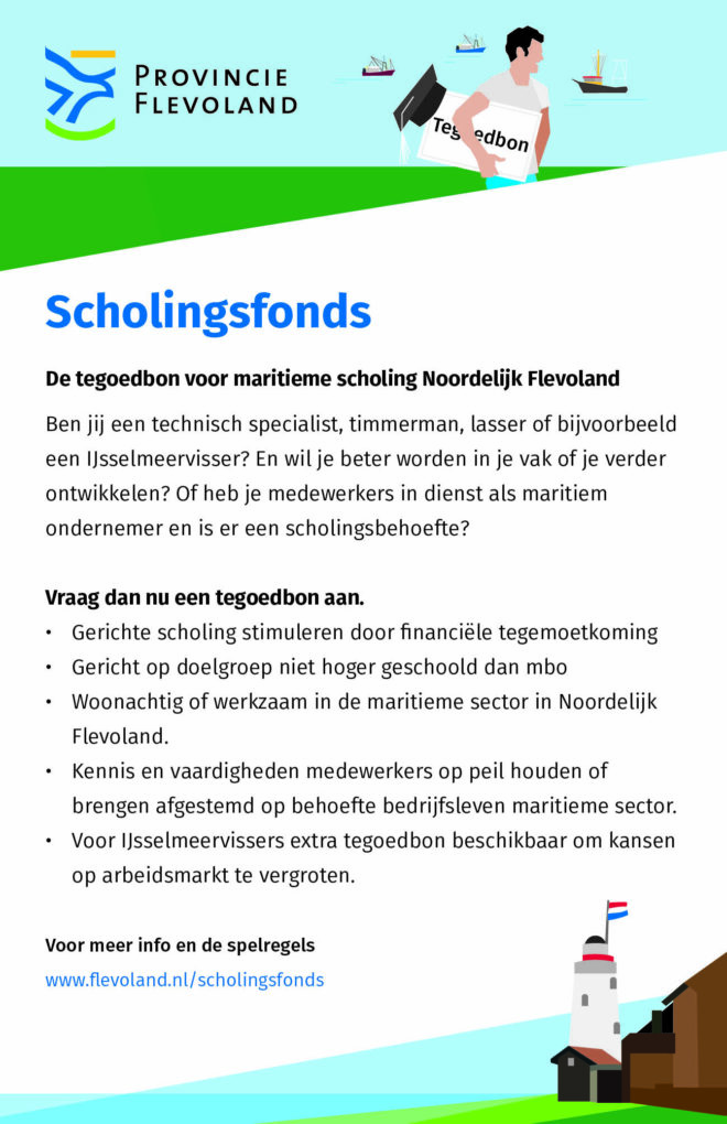 Het Scholingsfonds Maritiem Noordelijk Flevoland stimuleert maritiem technische scholing door (potentiële) arbeidskrachten een financiële bijdrage te bieden.